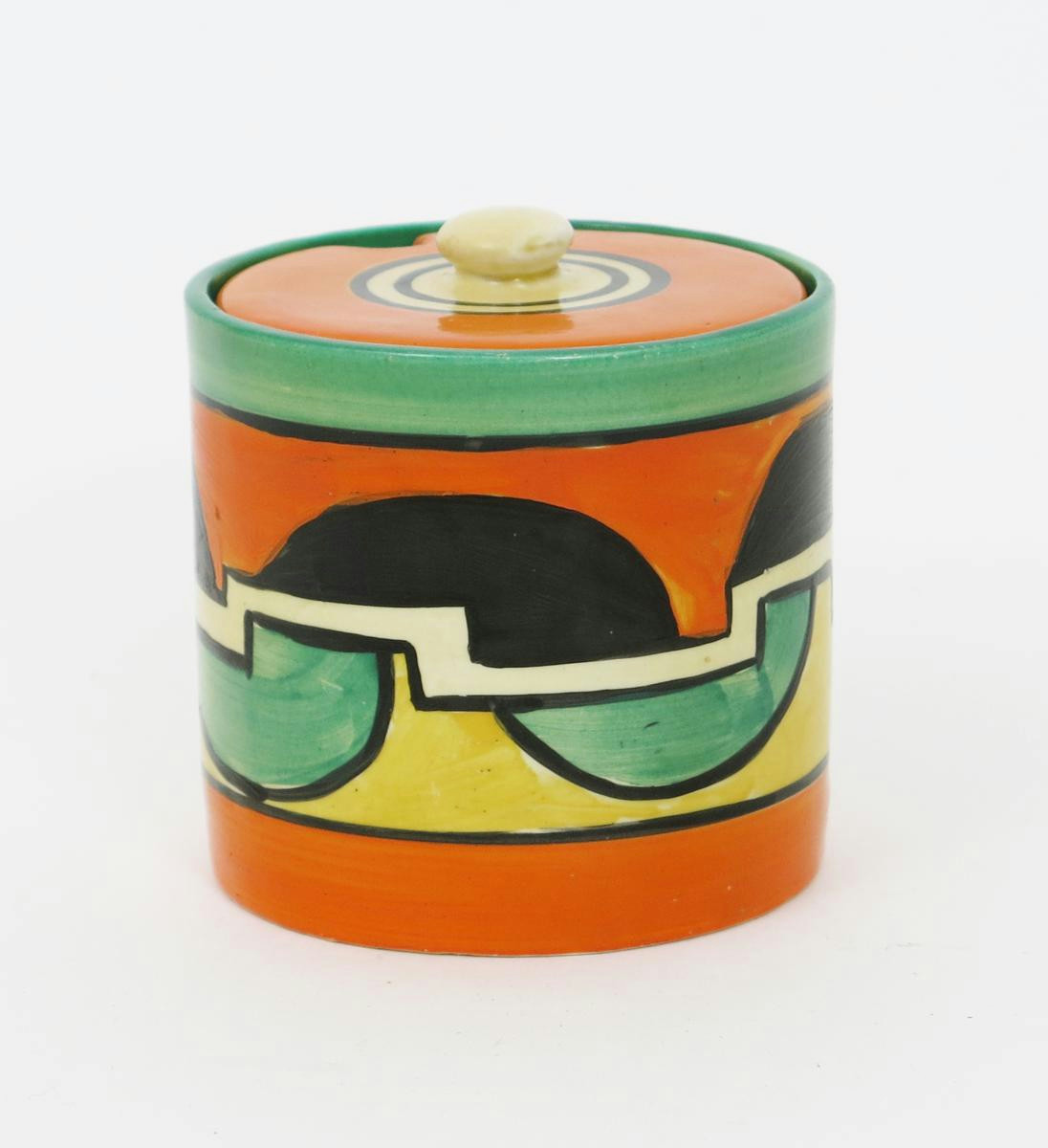 'Castellated Circle' a Clarice Cliff Fantasque Bizarre Cylindrical preserve pot and cover