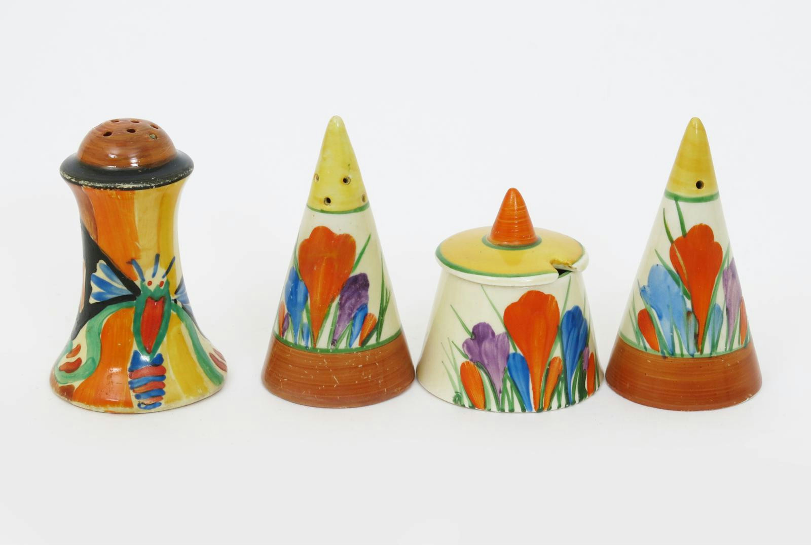 'Butterfly' a Clarice Cliff Fantasque Bizarre pepper pot, painted in colours, and a Clarice Cliff Crocus Conical cruet set printed factory marks,mustard cover restored, 8cm. high