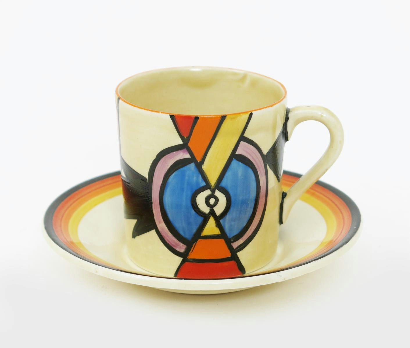 'Lightning' a Clarice Cliff Bizarre Tankard coffee can and saucer, painted in colours printed factory mark, 6.5cm. high