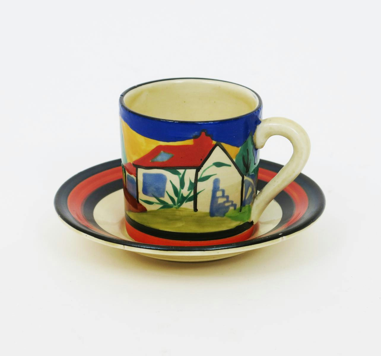 'Applique Blue Lugano' a Clarice Cliff Tankard coffee can and saucer, painted in colours printed and painted marks, 6cm. high