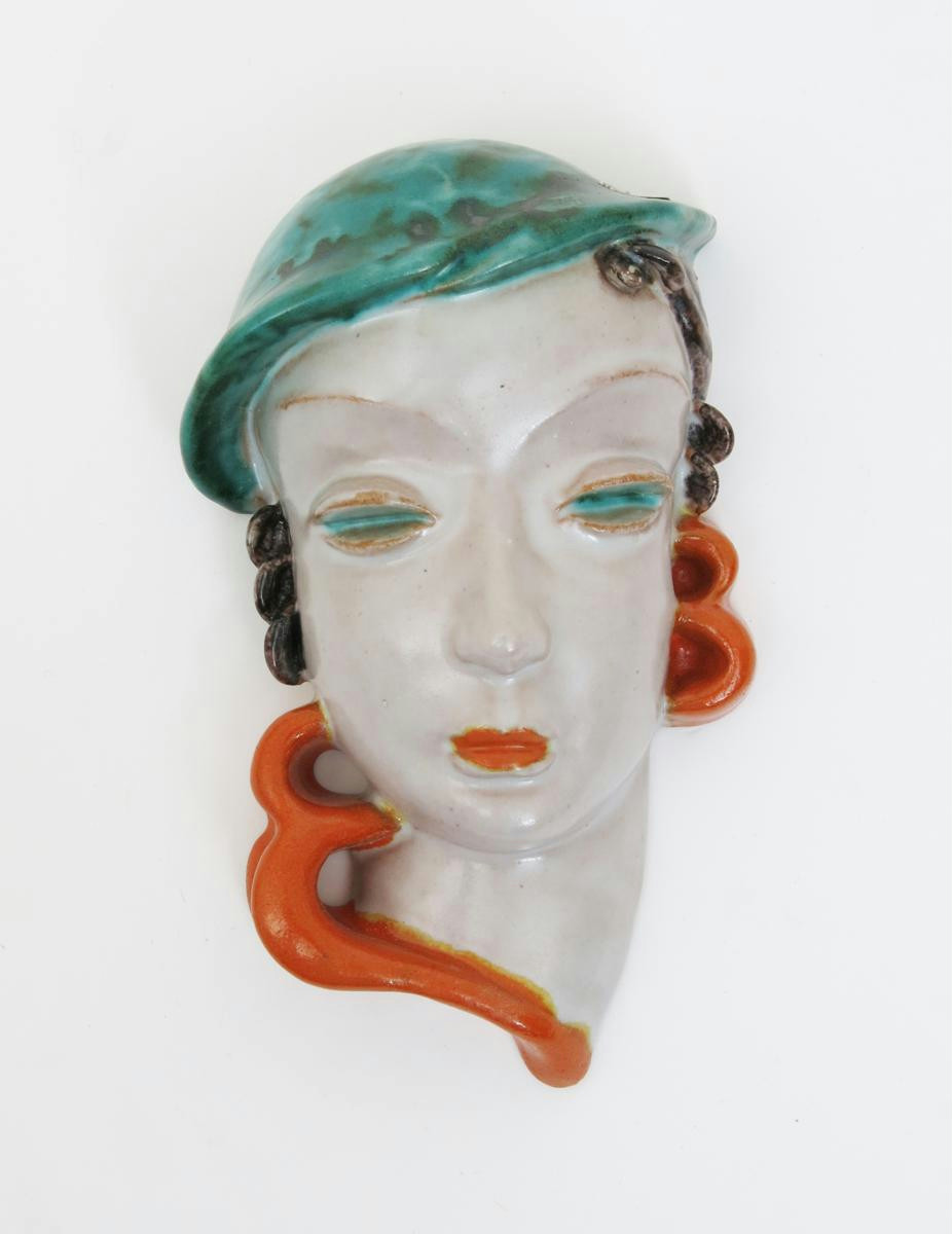 A Goldscheider Pottery mask of a woman wearing a blue beret