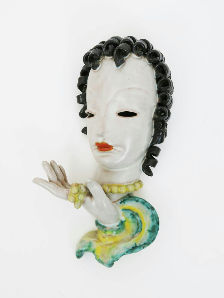 A Goldscheider Pottery mask of a woman with yellow bead necklace