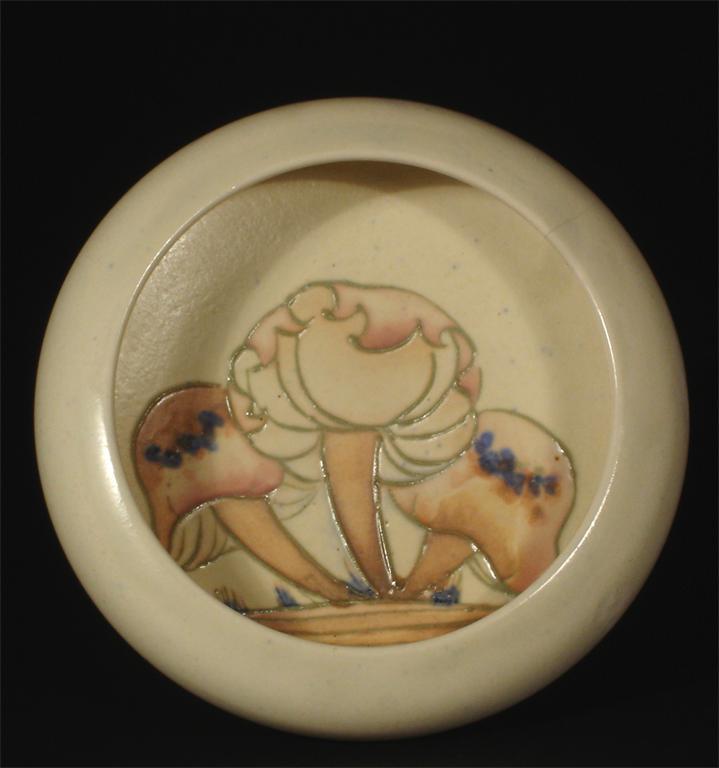 'Claremont' a Moorcroft Pottery salt-glaze dish painted in shades of pink and blue on a cream...