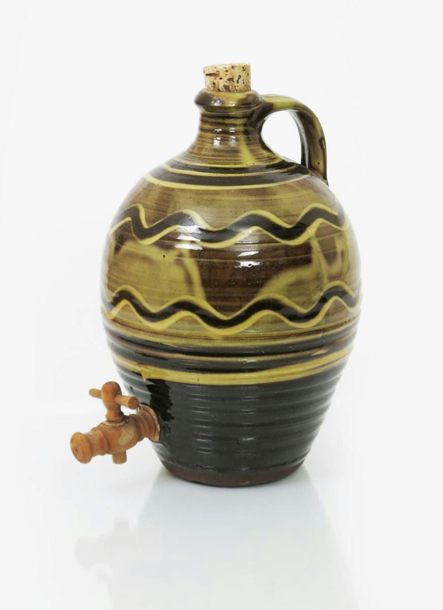 a Winchcombe Pottery stoneware cider jar, with wooden tap and cork bung, painted with combed decoration impressed seal mark, 33cm. high