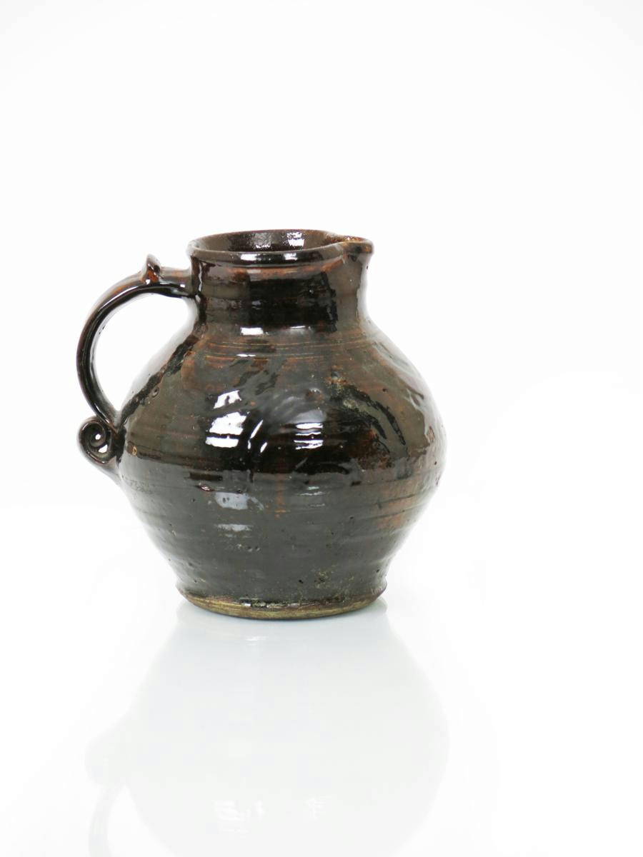 an Early pottery jug, ovoid with applied handle, painted in resist with geometric band in a treacle brown glaze impressed MC seal to base, minor glaze faults 20.5cm. high