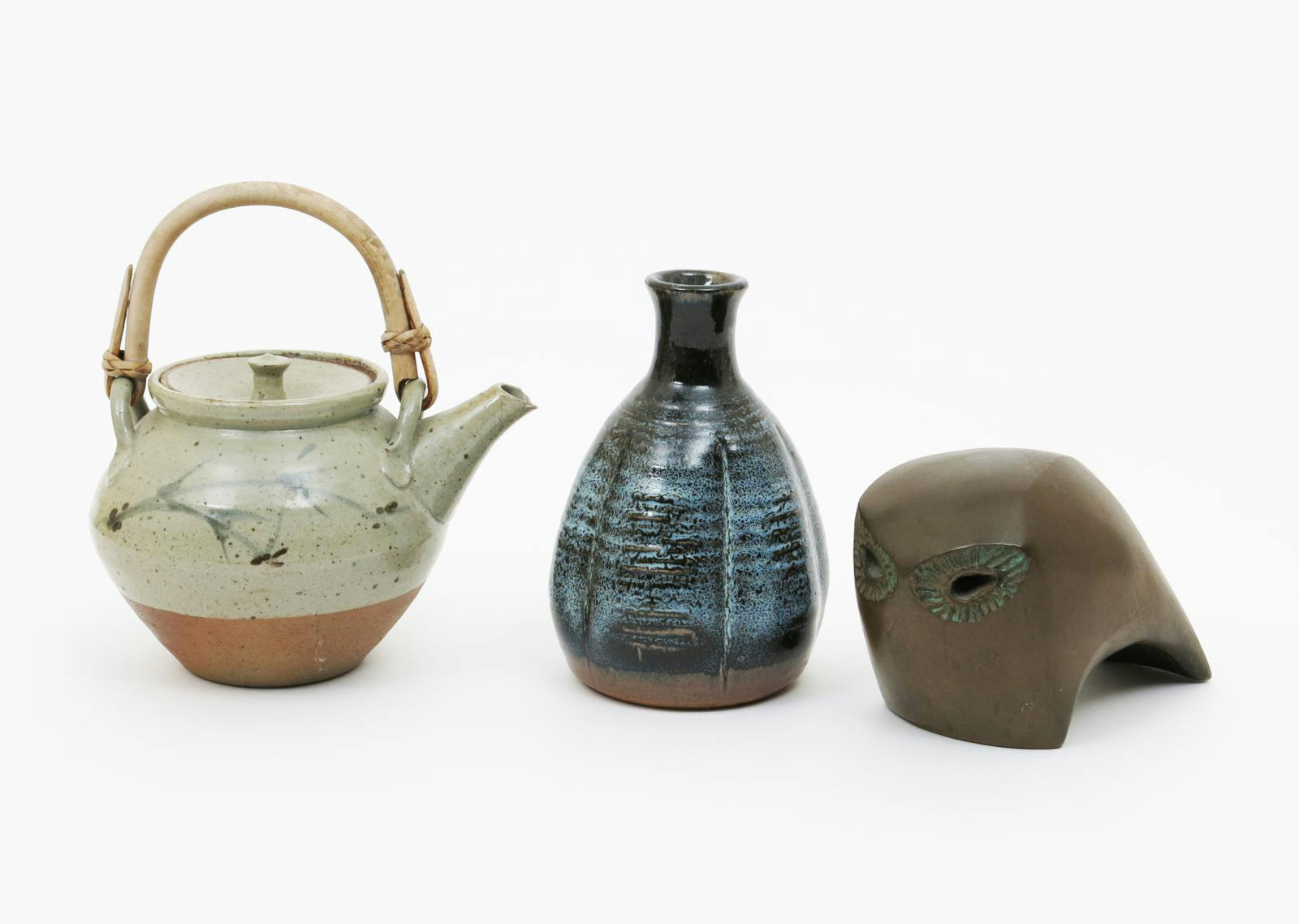 a Leach Pottery stoneware teapot and cover, painted with a simple brushed grass design in blue and tenmoku spots on a celadon glaze, a Paul Barron bottle vase, a Trevor Corser Leach Pottery tile, a Rosemary Wren owl and three other pots impressed seal marks, chips to spout of pot 13cm. high (7)