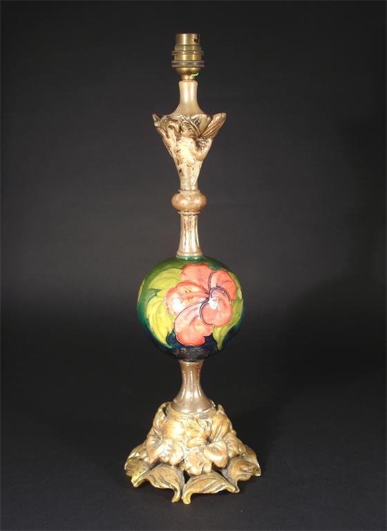 'Hibiscus' a Moorcroft Pottery ovoid lamp designed by Walter Moorcroft, with silvered resin mounts, unmarked overall height 46cm.