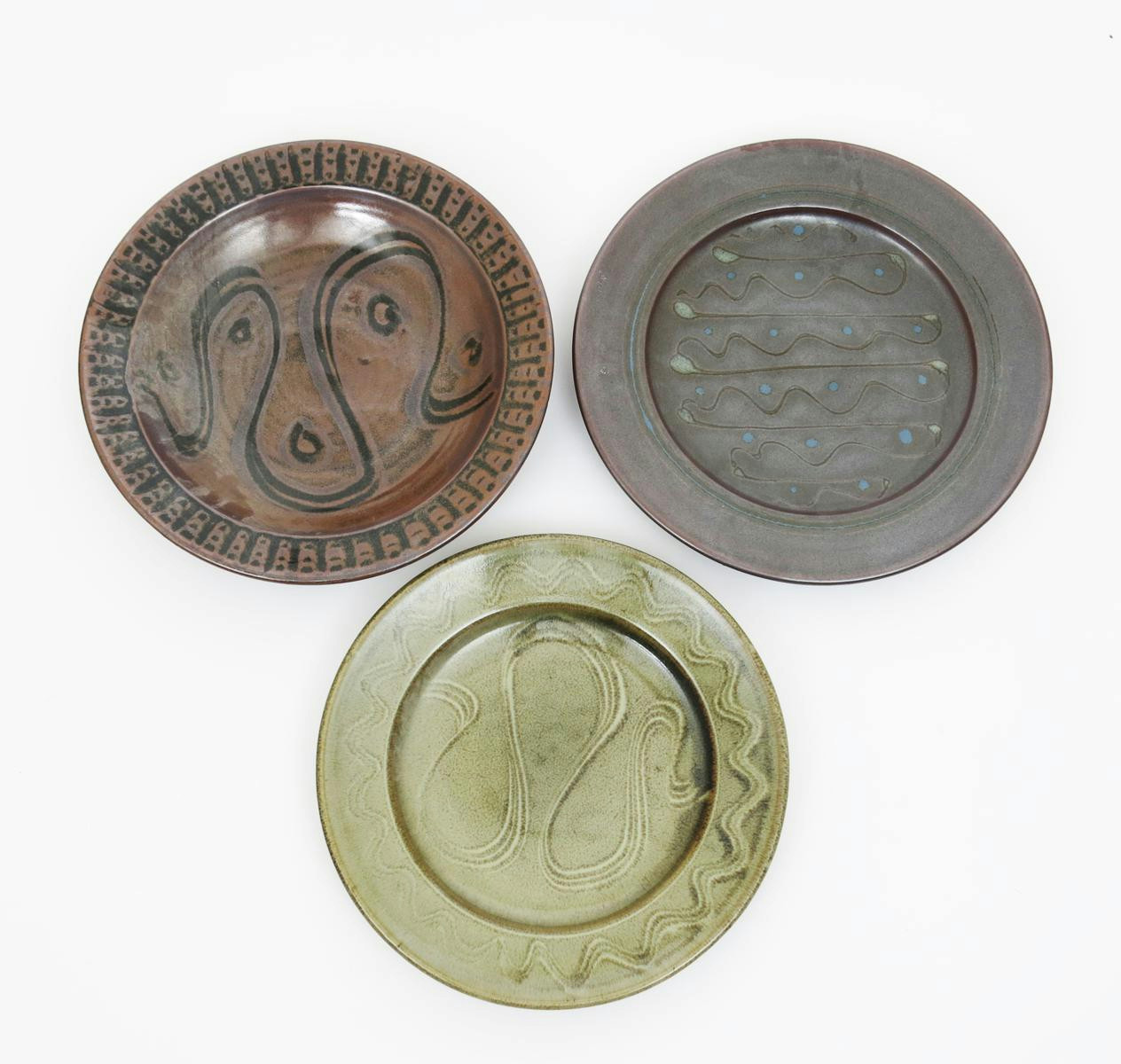 a Winchcombe Pottery stoneware charger, decorated with a simple trailed design to well and rim, under an ash glaze, another Ray Finch charger glazed tenmoku and another charger impressed seal mark, 34cm. diam.