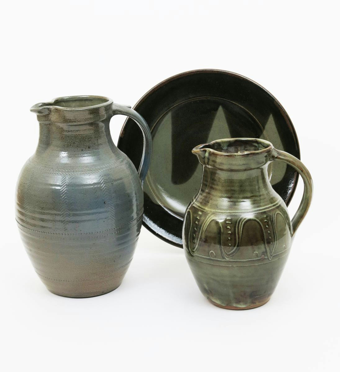 a Winchcombe Pottery jug, painted with a simple wavy line design in brown on an ash glaze, a charger and a salt-glazed jug impressed seal marks, 25.5cm. high (3)