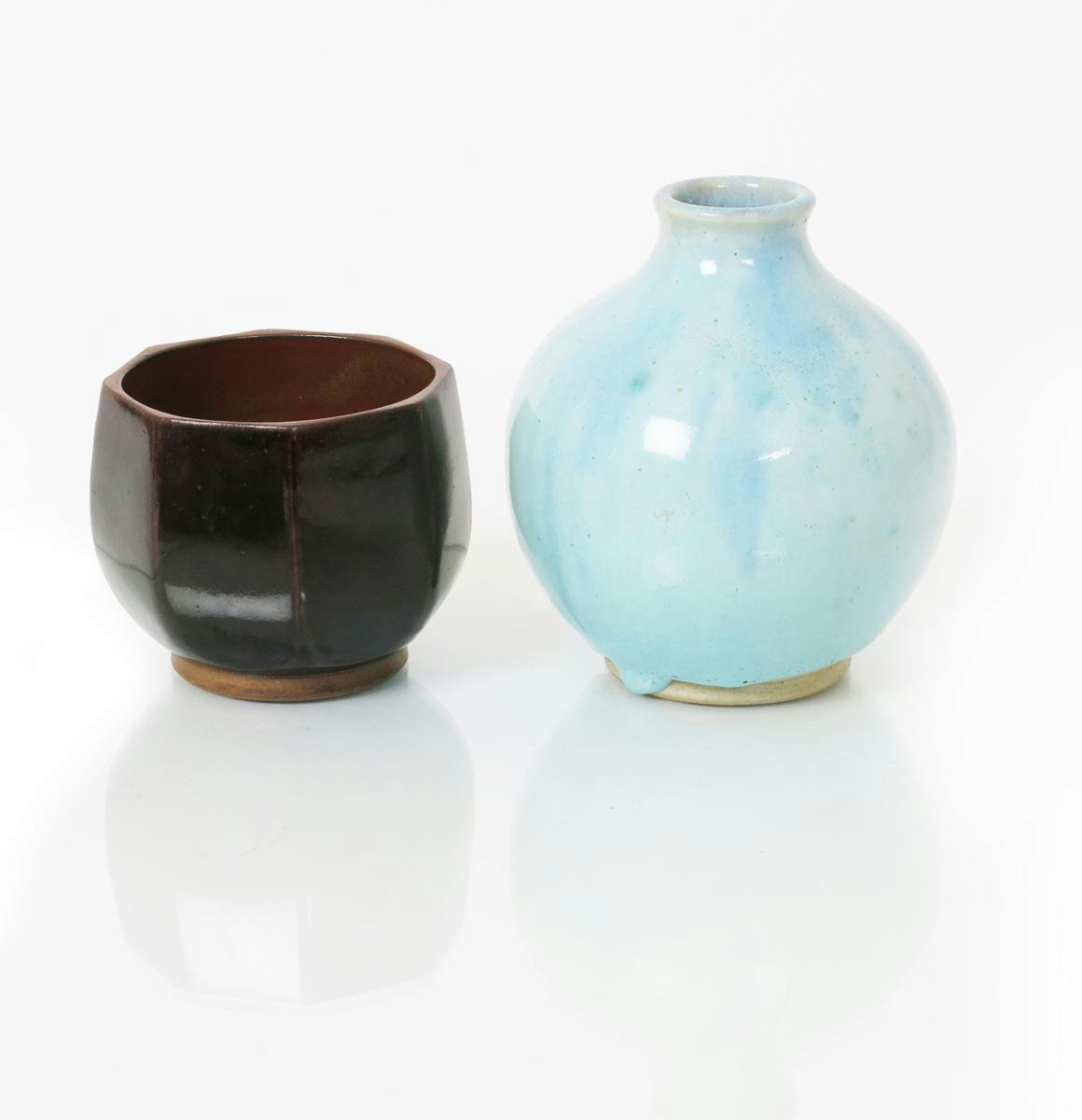 an ovoid stoneware vase, dated 1928, covered to the foot with a thick pale blue running glaze, and a Tenmoku glazed pot incised C Vyse 1928 15.5cm. high (2)