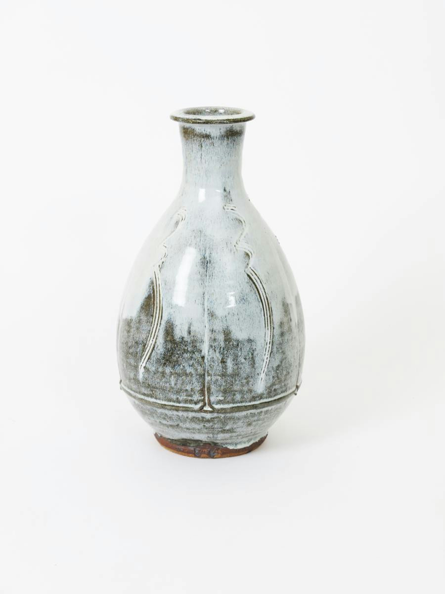 an Ainstable Pottery vase, fluted, bottle form, incised with simple comb decoration, covered in a running white ash glaze to the foot, impressed seal marks, 35cm. high