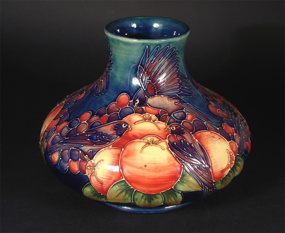 'Finches Blue' a Moorcroft Pottery vase designed by Sally Tuffin