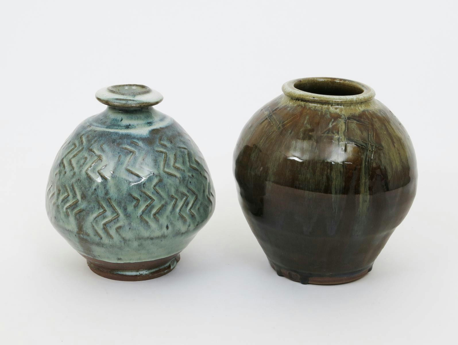 a stoneware vase, ovoid form with collar rim, decorated with zigzag motif, under an ash glaze, and another Mike Dodd vase similar impressed seal marks, 20cm. high (2)