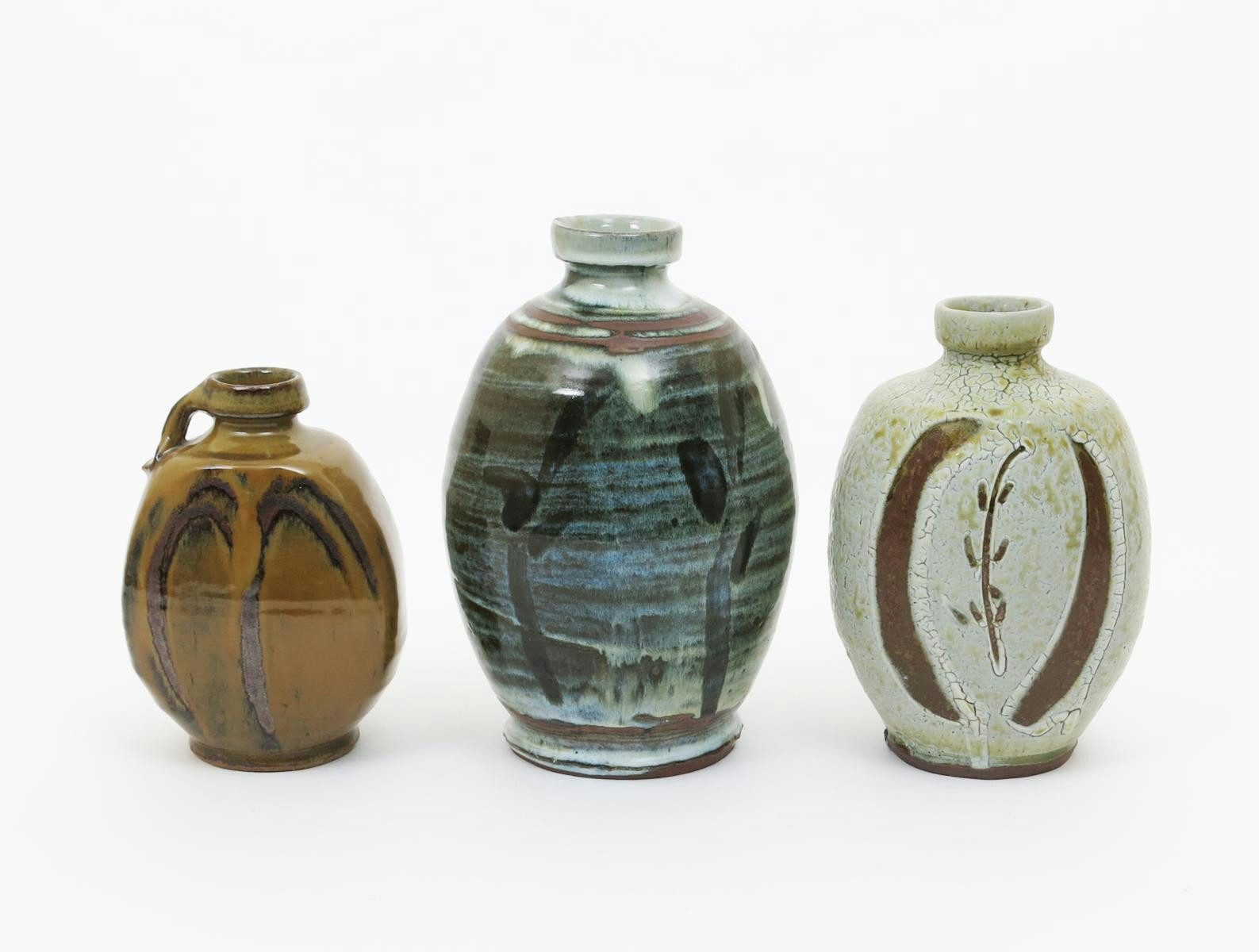 a shouldered stoneware vase, decorated in resist with a simple grass design under a thick celadon glaze, another Mike Dodd vase with loop handle decorated with a willow tree and another vase impressed seal marks, 24cm. high (3)