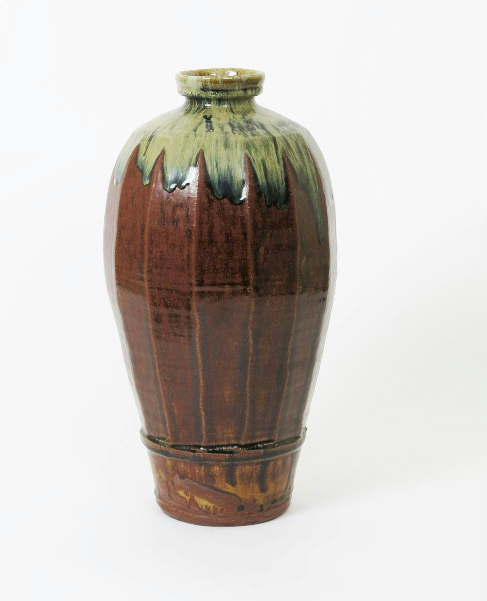 a tall stoneware vase, shouldered, faceted form covered in a running tenmoku glaze, the shoulder with running, thick ash glaze impressed seal mark, 42cm. high