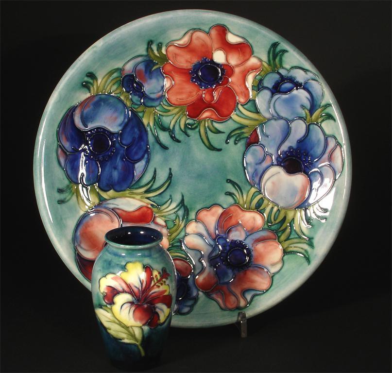 'Hibiscus' a Moorcroft Pottery vase, designed by Walter Moorcroft, painted in colours, and an 'Anemone' Moorcroft Pottery plate impressed and painted marks vase 11cm. high