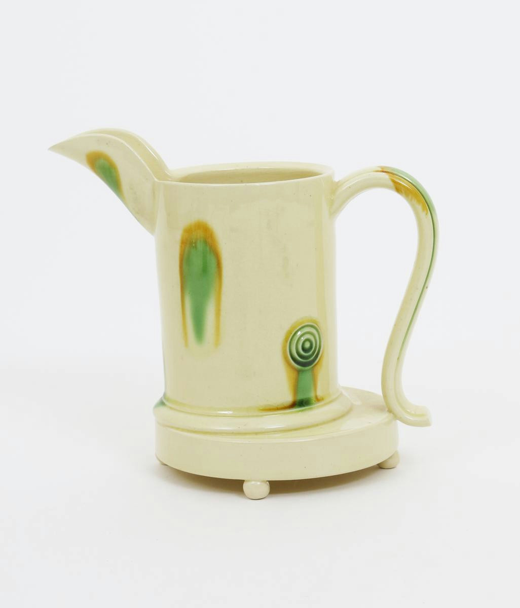 a Whieldon jug, on offset base, covered in a pale yellow glaze with green and yellow splashes impressed seal mark to side 17cm. high