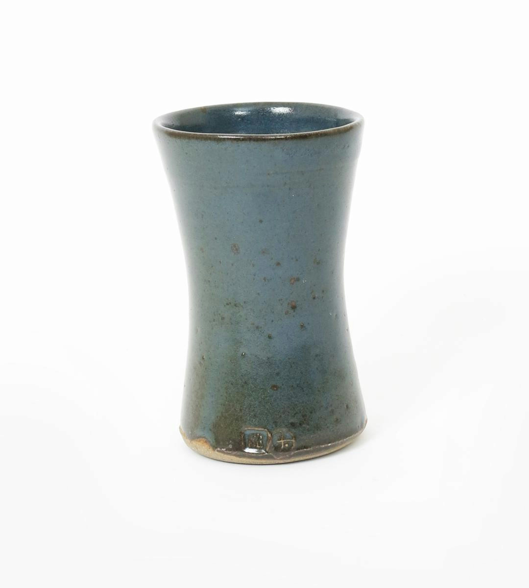 a Leach Pottery stoneware vase, waisted cylindrical form, covered to the foot in a speckled blue glaze impressed seal marks, 17cm. high