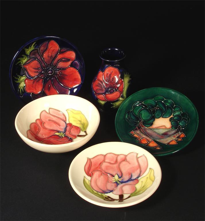 'Anemone' a Moorcroft Pottery vase designed y Walter Moorcroft, and four pin dishes various marks 10cm. high