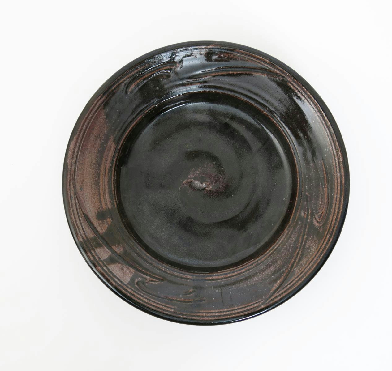a stoneware charger, incised with simple stroke design, covered in a tenmoku glaze, impressed seal mark, 34.5cm. diam.