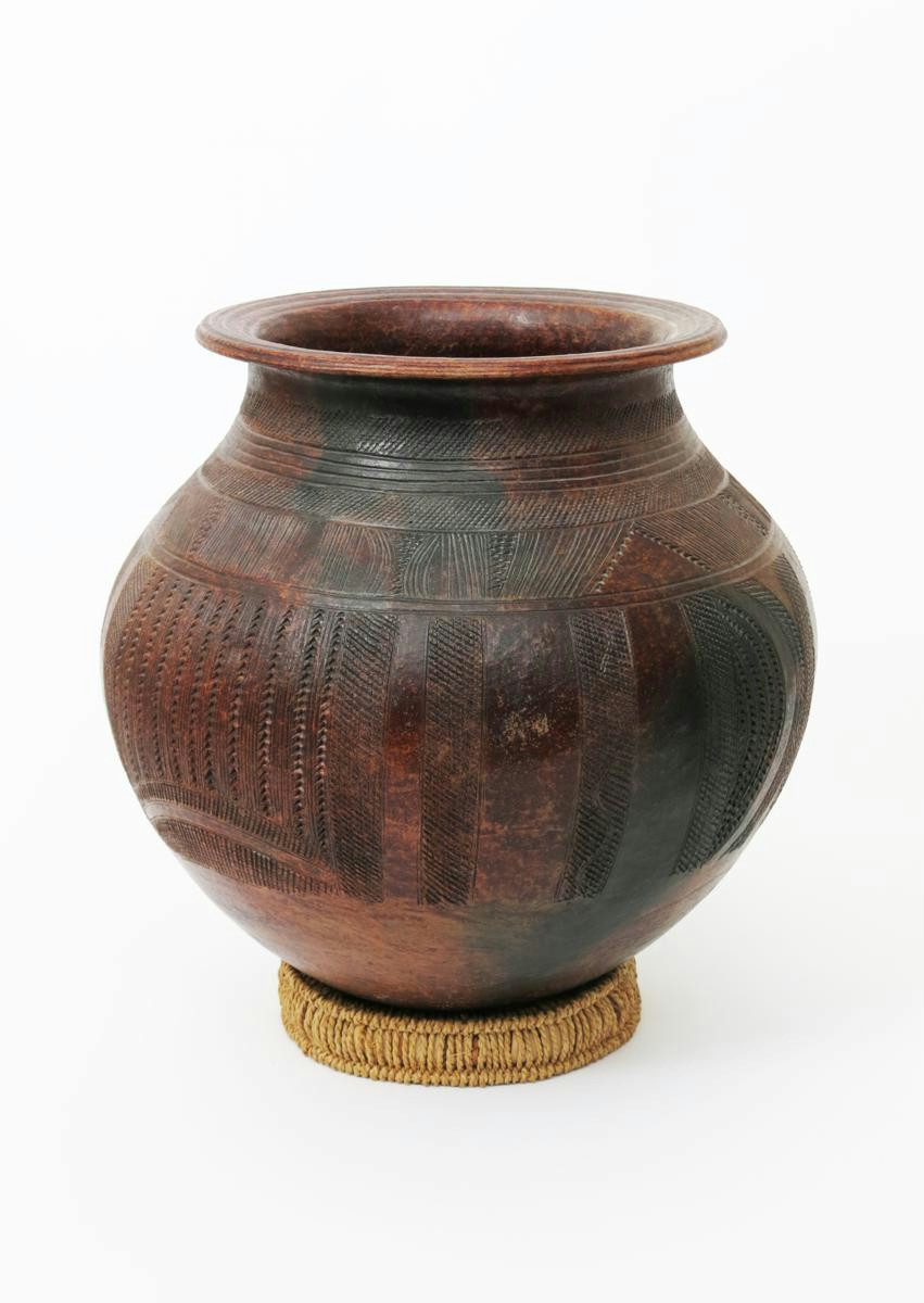 a large earthenware vase, ovoid with everted rim, incised with geometric design, with woven string stand, unsigned 38cm. high
