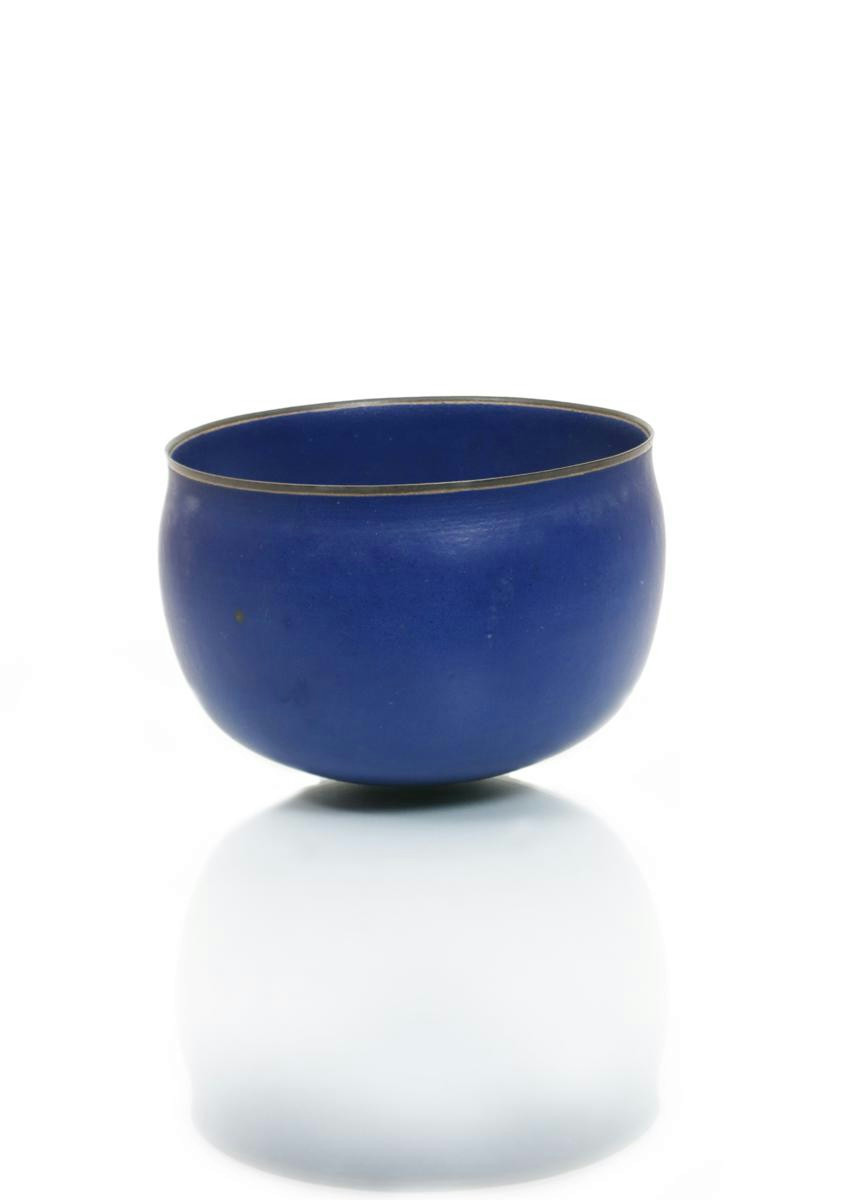 a large open bowl, covered in a rich lapis lazuli glaze with bronze rim, incised Alev, 23cm. high, 30cm. diam.
