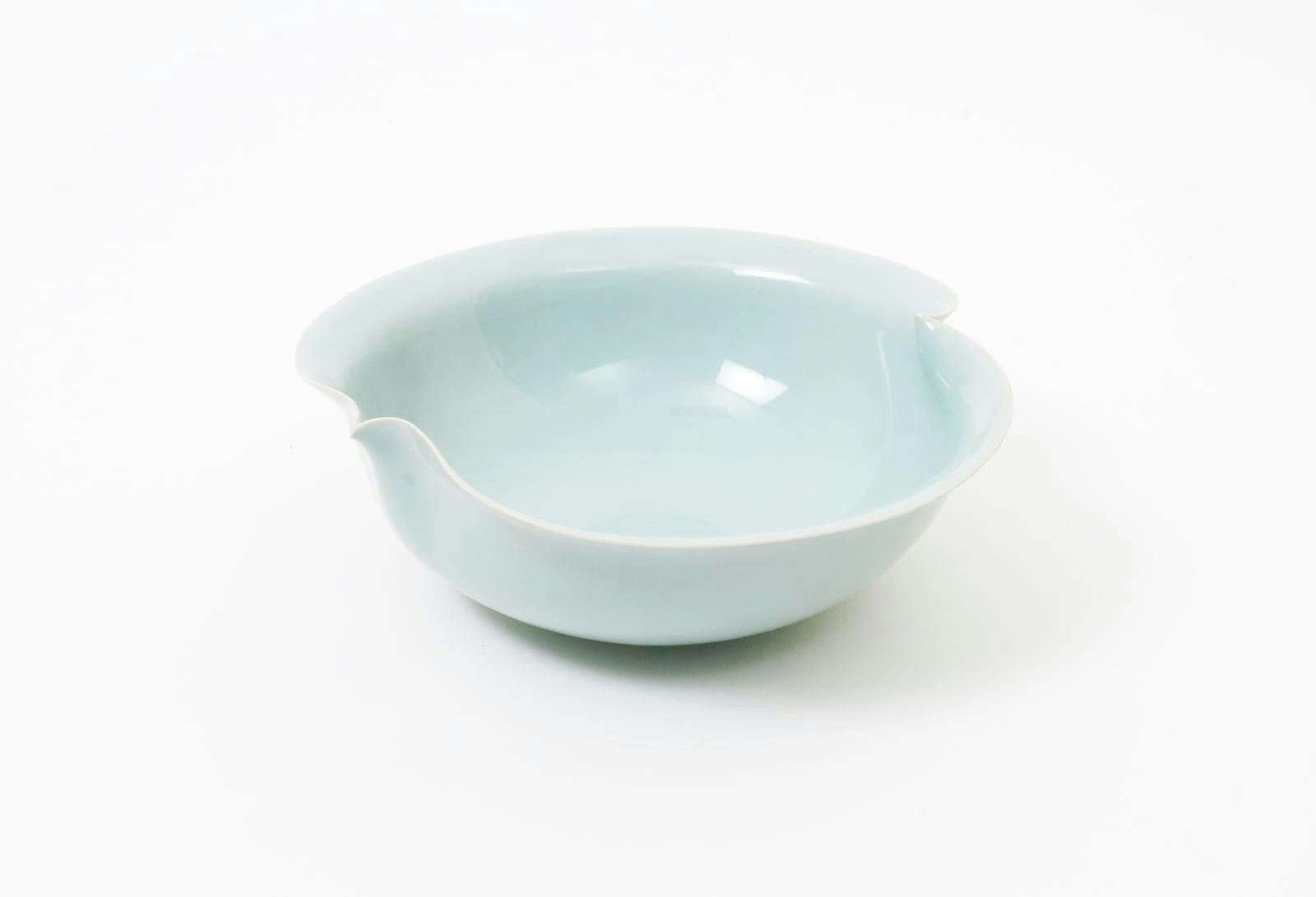 a porcelain bowl with pinched rim, covered in a celadon glaze, with original fitted box, signed to the underside of the box lid, re-stuck chip to rim 23.5cm. diam.