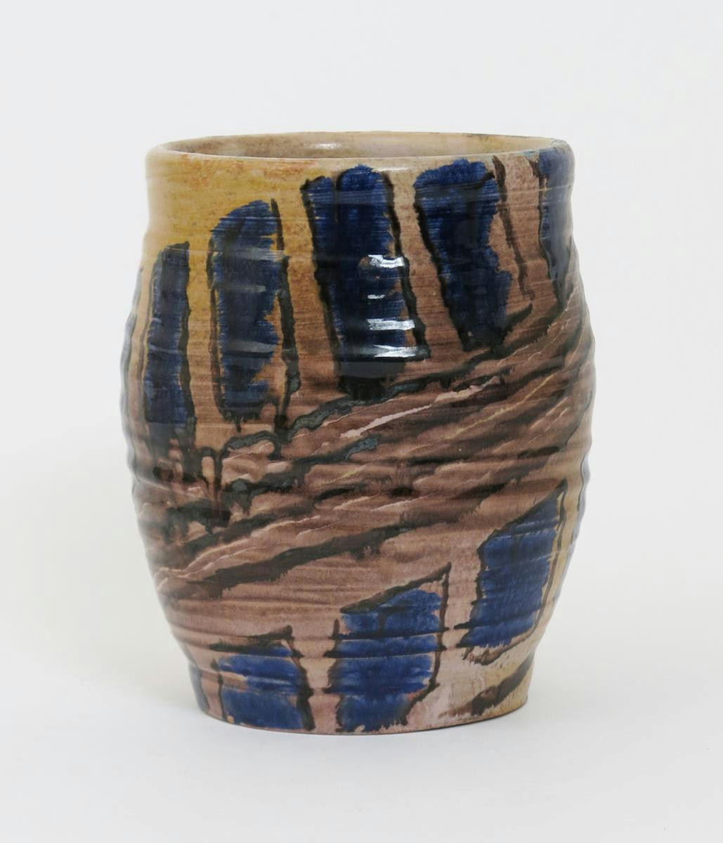 a Fulham Pottery vase, barrel form, painted with geometric design in blue, yellow and ochre indistinct marks to base 19cm. high