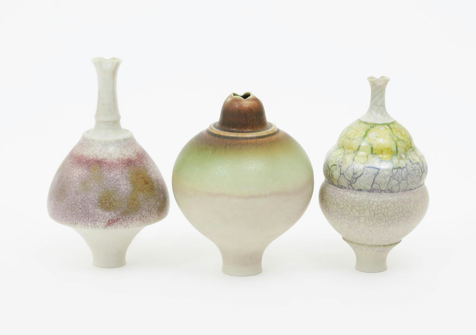 three porcelain vases, glazed in colours incised S marks, 15cm. high (tallest) (3)