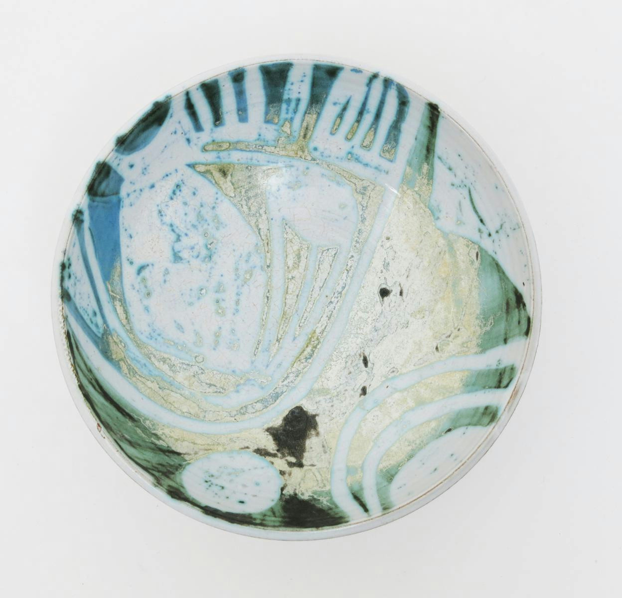 an early terracotta footed bowl, decorated in resist with abstract design in the style of the Picassoettes, incised signature 17cm. diam.