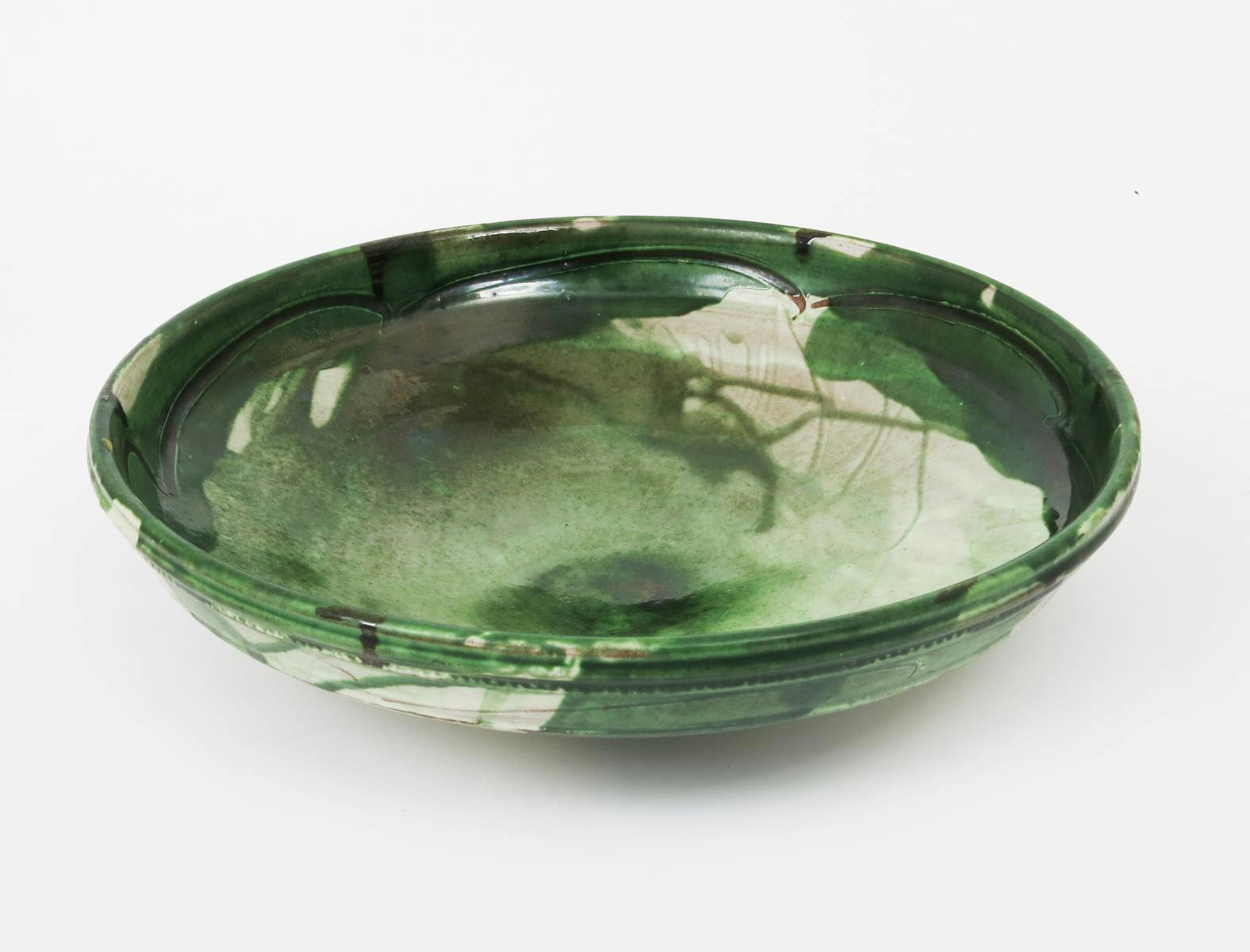 a large flat earthenware bowl, slip decorated with white under a brushed green glaze 43.5cm. diam.