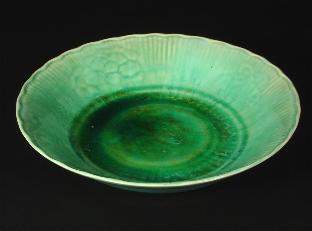 An early Pilkington's Lancastrian bowl circa 1903-1904, modelled in low relief with floral panels, glazed in a light blue/green glaze printed bee mark, paper collection label 23cm. diam. Provenance The Bill Coles Collection