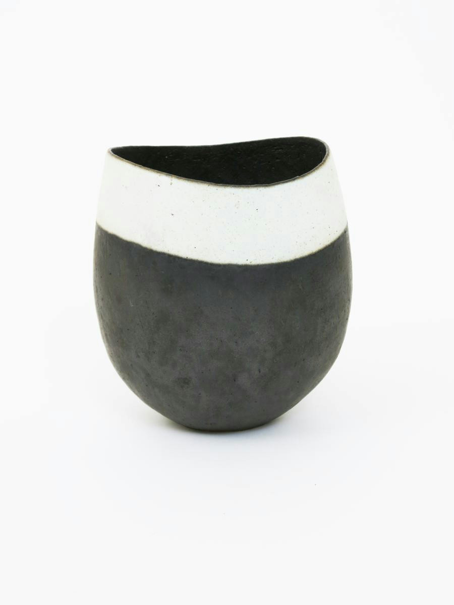 a hand built stoneware vase, slender from with pulled up rim, glazed with broad white stripe to top rim, over black ground impressed seal mark, 19cm. high