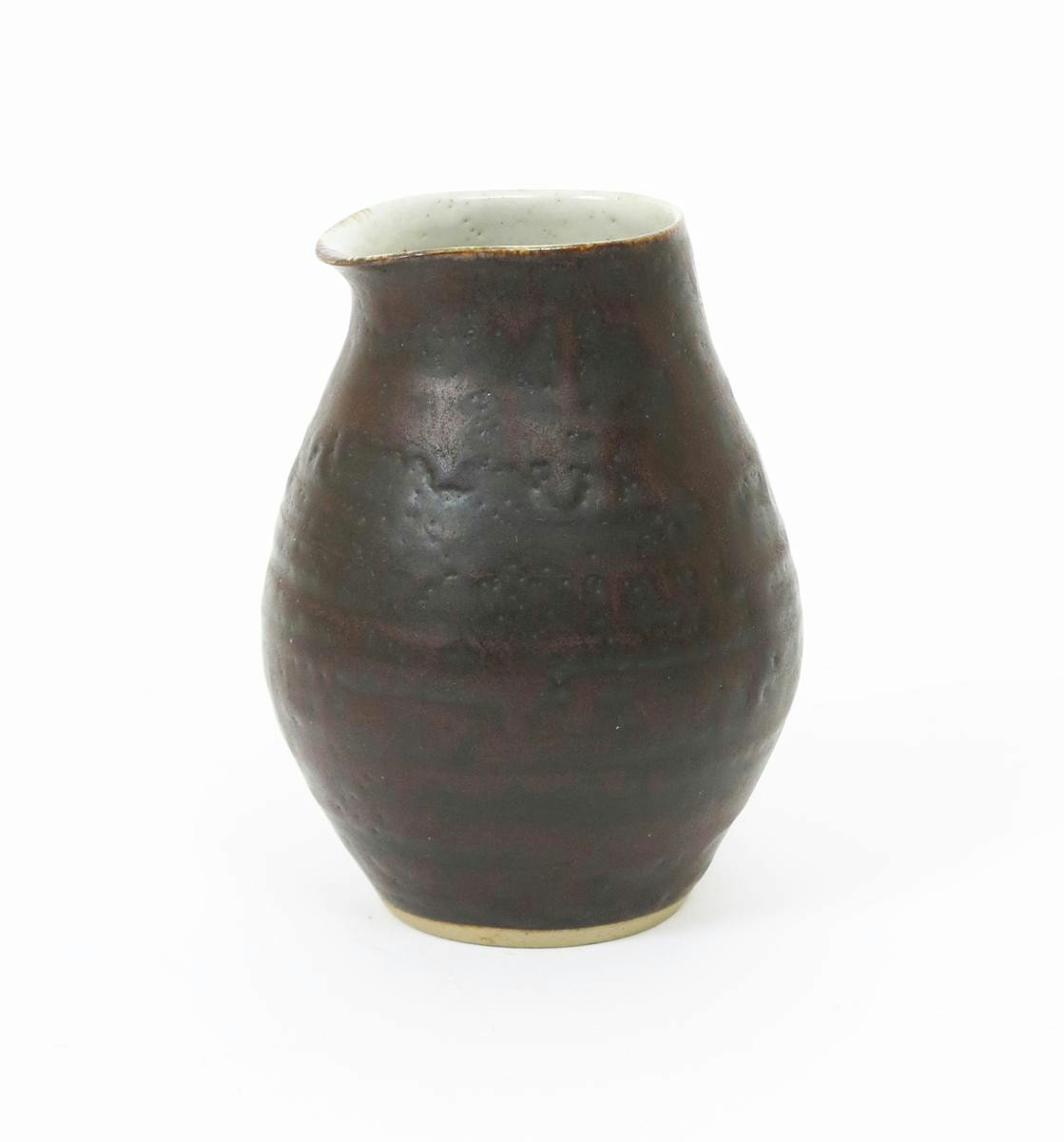 a stoneware pouring vessel, ovoid with pulled rim, covered in a manganese glaze over grey impressed seal mark 9cm. high
