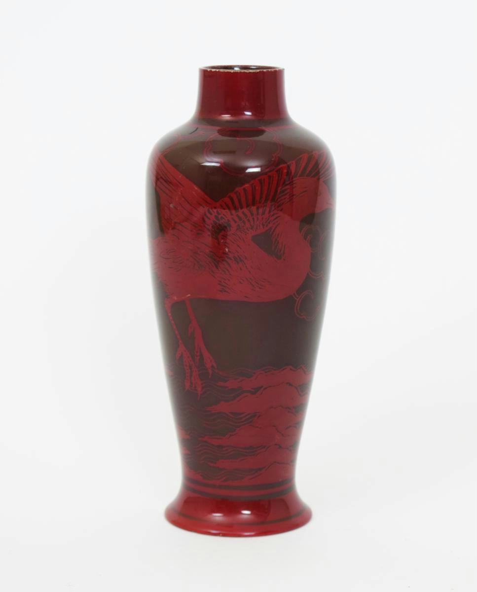 A Bernard Moore vase, shouldered baluster form, painted with a crane and finches flying above stylised clouds, covered in a flambe glaze painted Bernard Moore mark, rim frits 24cm. high