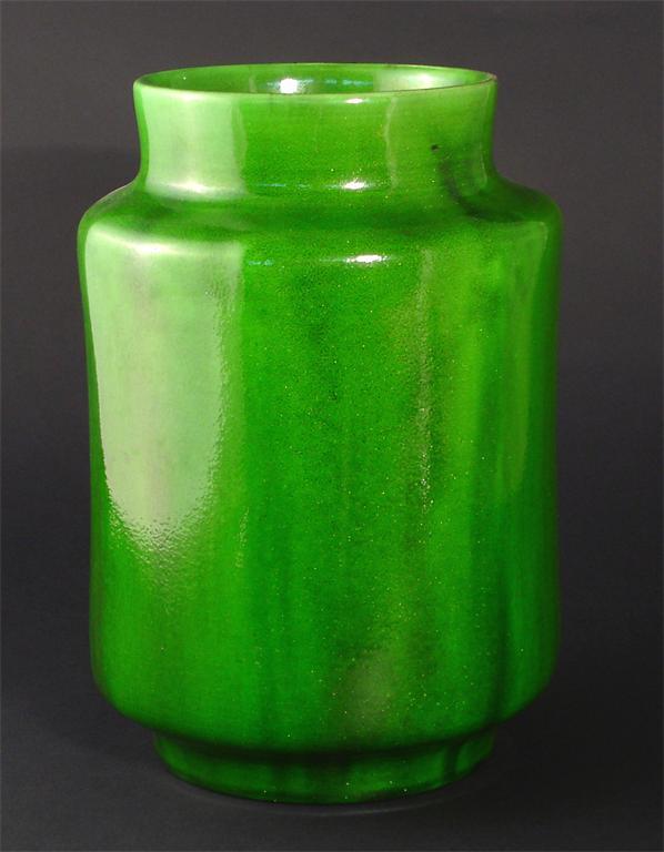 An early Pilkington's Lancastrian vase circa 1903-1904, cylindrical form with collar rim, covered in a green aventurine glaze printed bee mark, collection paper label, chip to base rim, 25cm. high Provenance The Bill Coles Collection