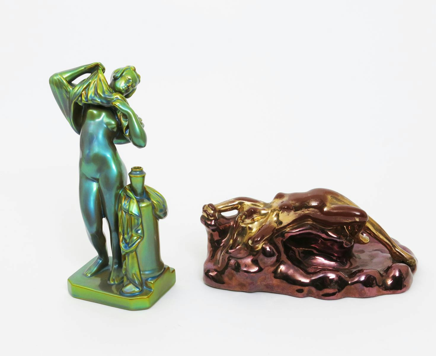 A Zsolnay Pecs model of a woman undressing, covered in a golden green lustre glaze, and an Art Nouveau continental pottery model of a draped nude female covered in a red lustre printed gilt mark, impressed 12, red figure with old restorations, 26cm. high