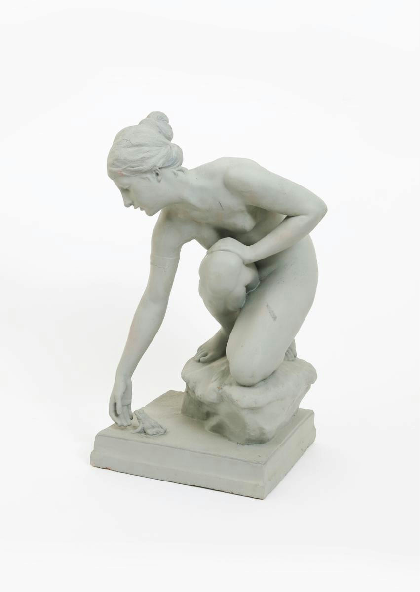 A tall terracotta sculpture of a woman crouching cast from a model by Emil Caver, dated 1903, modelled crouching to pick up a frog, painted grey signed in the cast and dated 60cm. high