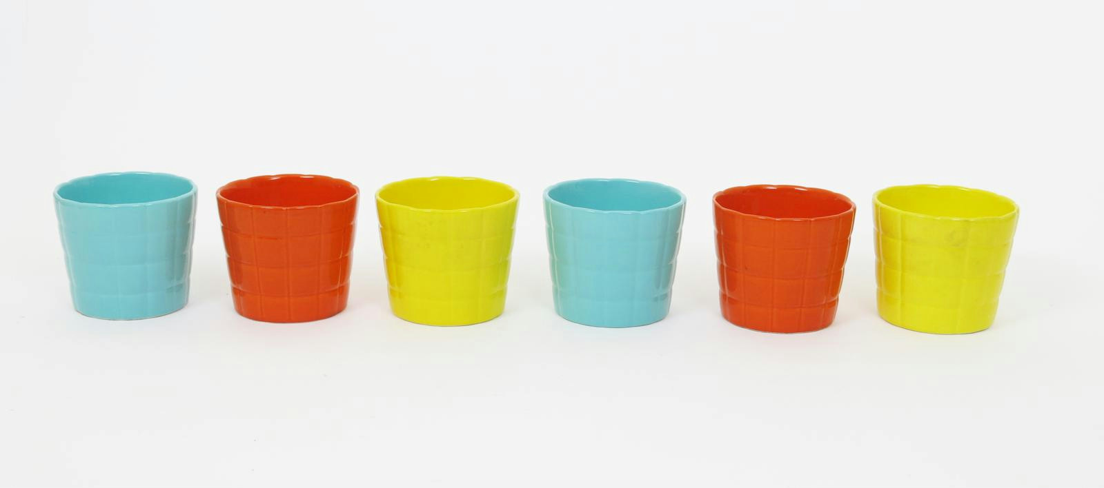 Six Richard Ginori earthenware flower pots, modelled, flaring cylindrical form, covered in sky blue, orange and vivid yellow glazes printed Richard Ginori mark 9.52.6, 11cm. high