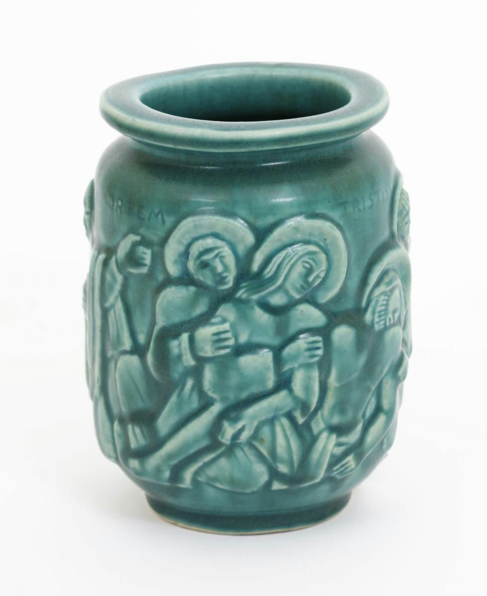 A Saxbo Danish stoneware vase by Jais Nielsen, shouldered form modelled in low relief with saints and Roman soldiers gathered around the dead Christ figure, glazed green impressed and incised marks, 16cm. high