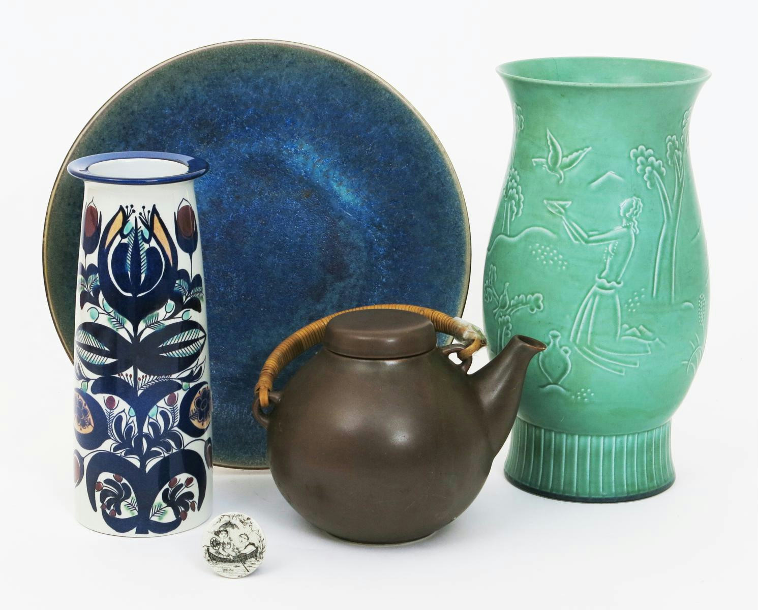 An Arabia Finland teapot and cover designed by Ulla Procope-Nyman, covered in a matt brown glaze, an Arabia stoneware dish, A Royal Copenhagen Faience tall vase and three other items printed marks, teapot cracked 16cm. high (6)