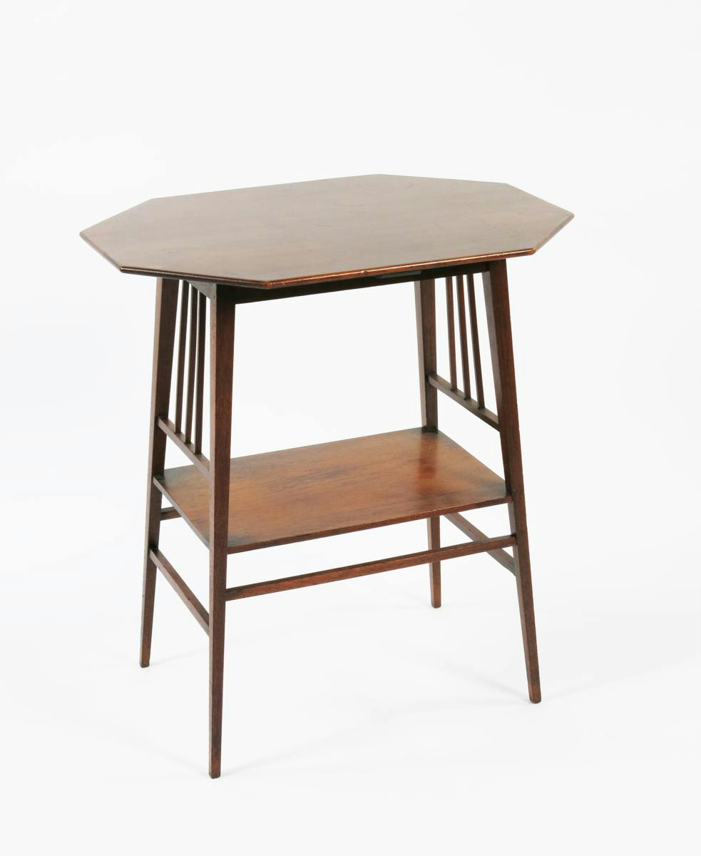 A James Shoolbred mahogany occasional table, possibly designed by H.W. Batley, model 9105, octagonal top over flaring legs and rectangular shelf stamped number 61 x 45cm top, 67cm high
