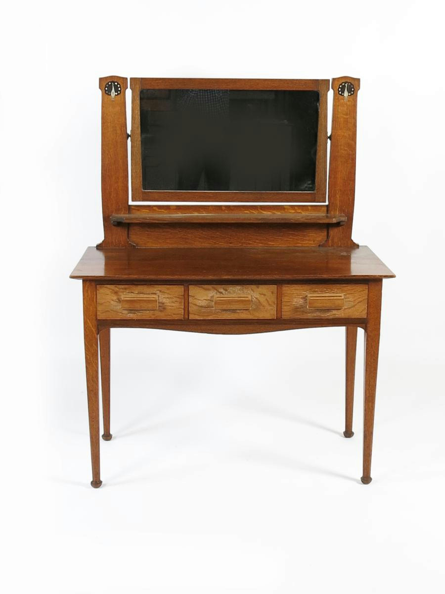 A Heal's oak Fine Feathers dressing table probably designed by Ambrose Heal, inset with pewter bird motif, Fine Feathers Make Fine Birds,107cm. wide, 140cm. high