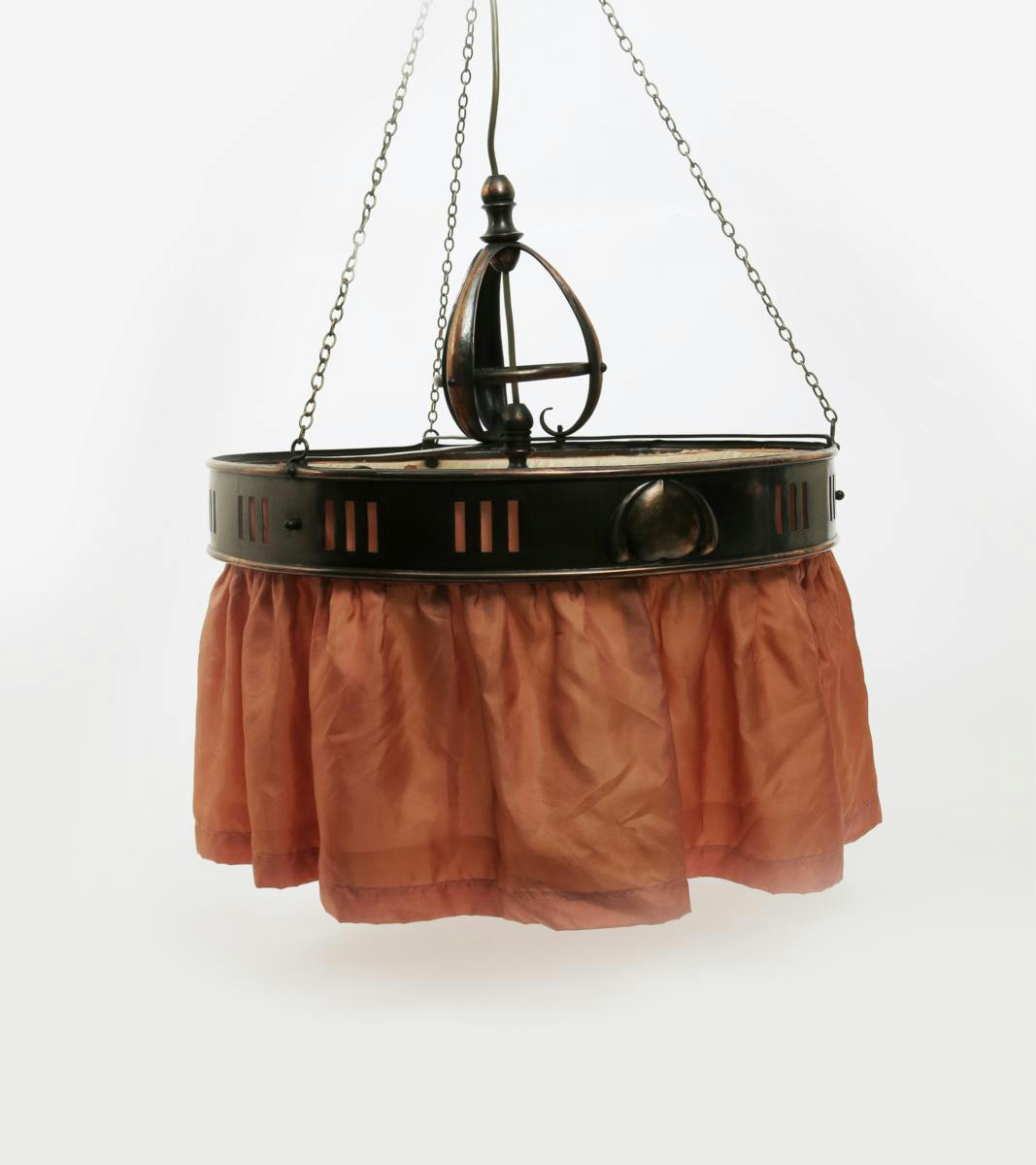An Arts and Crafts patinated copper twin-branch ceiling light, the pierced circular section body with pink silk hanging shade, with central rod flanked with three scrolling supports unsigned 53cm. diam.