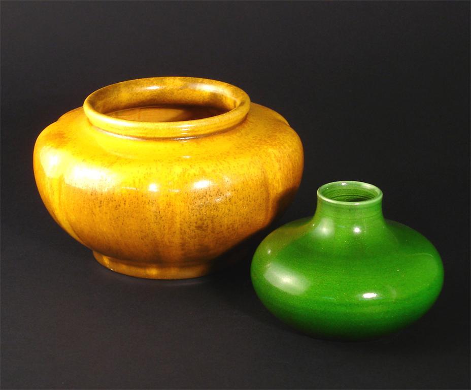 An early Pilkington's Lancastrian vase circa 1903-1904, covered in an orange and aventurine glaze, and a green aventurine glazed vase orange vase printed bee mark, paper labels to both 9.5cm. high Provenance The Bill Coles Collection