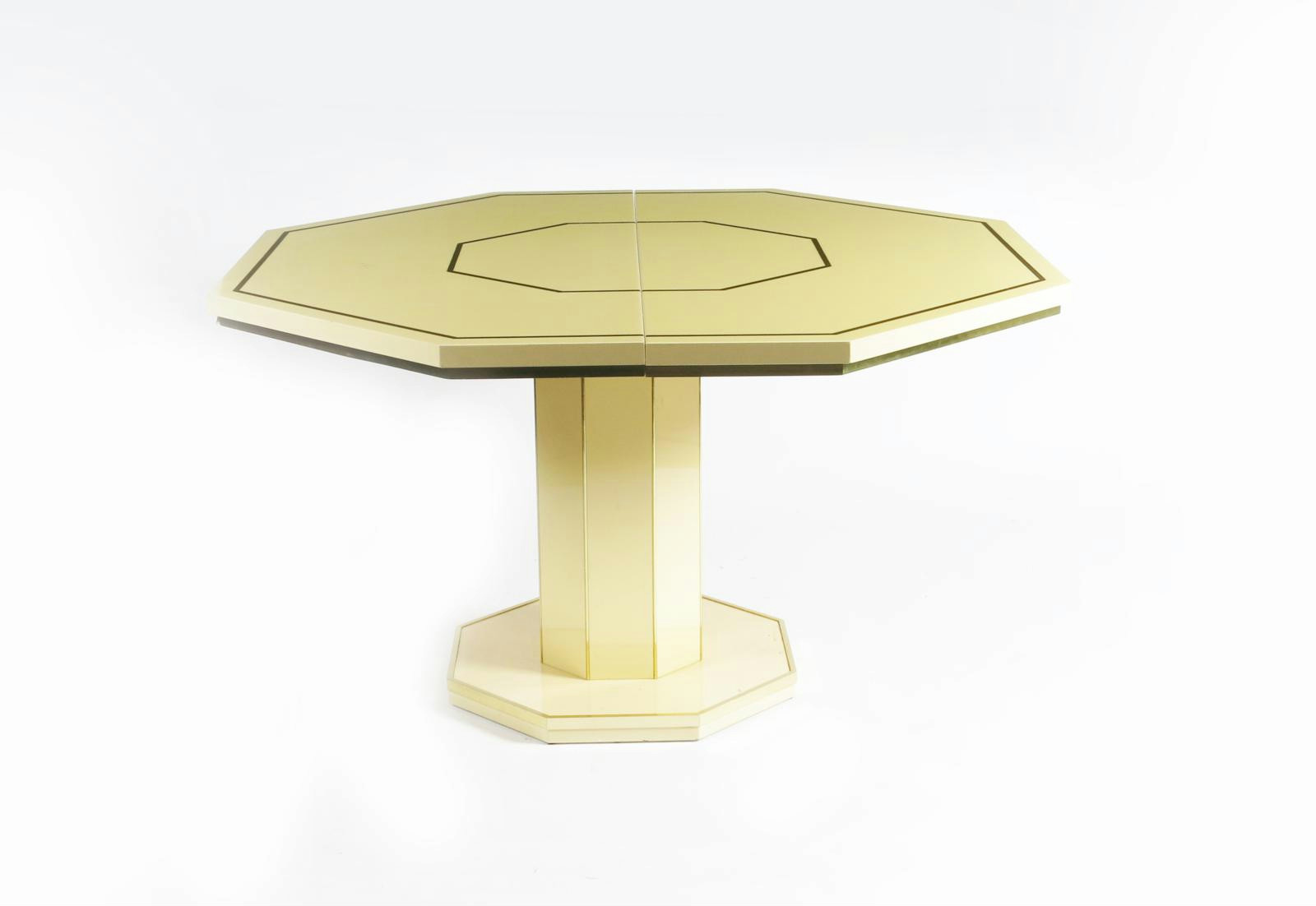 A Paco Rabanne cream lacquered dining table, the faceted central pedestal supporting octagonal top with single extension leaf, remains of signature Paco Rabanne to side to top, 130cm. wide.