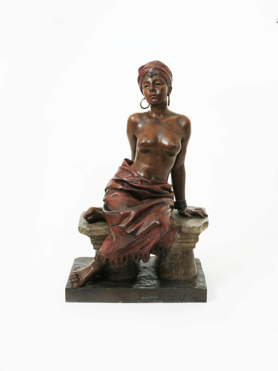 Shackled a large patinated and cold painted bronze figure cast from a model by Emmanuel Villanis, modelled as a nubina slave, bare-breasted with red skirt and turban, signed in the bronze E Villanis 59.5cm. high