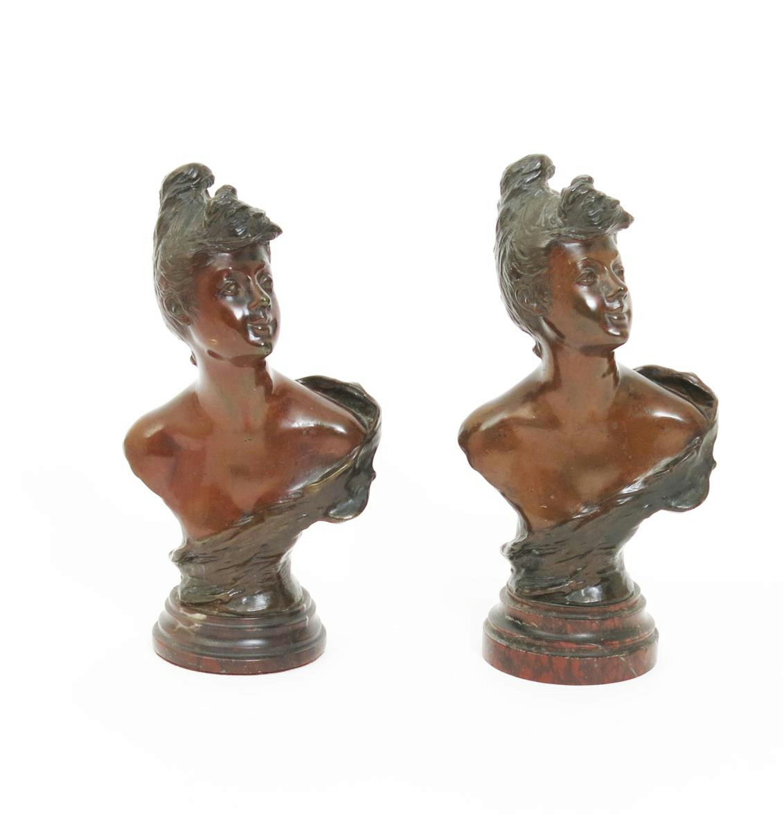 A pair of patinated bronze Art Nouveau busts cast from a model by H. Vidal