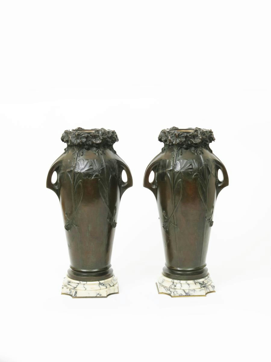 A pair of Art Nouveau patinated bronze vases cast from a model by Edmond Moreau-Sauve, cast with twin-handles, the rim flower encrusted on sinuous foliate stems, on white marble bases, signed in the case Moreau Sauve 49cm. high