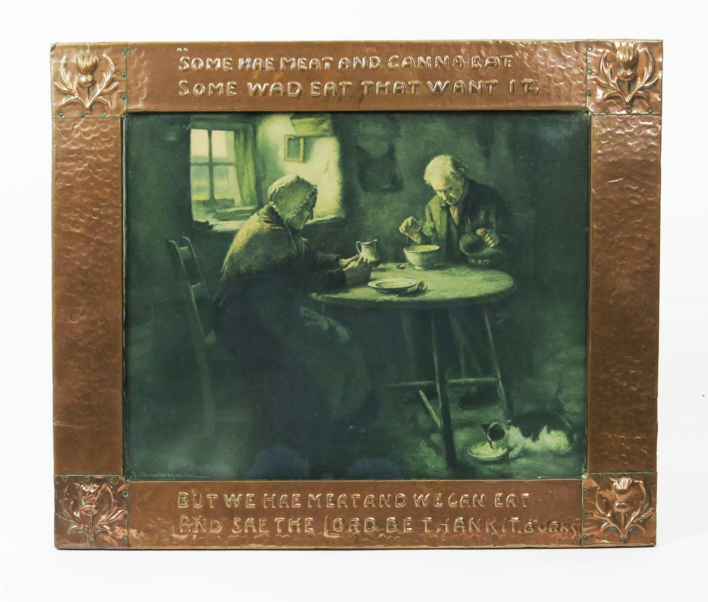 An Arts and Crafts copper frame, rectangular, stamped in low relief with thistle and Robbie Burns quotes, with Burn's Grace print by Henry John Dobson ARCA (1858-1928), 62 x 52cm.